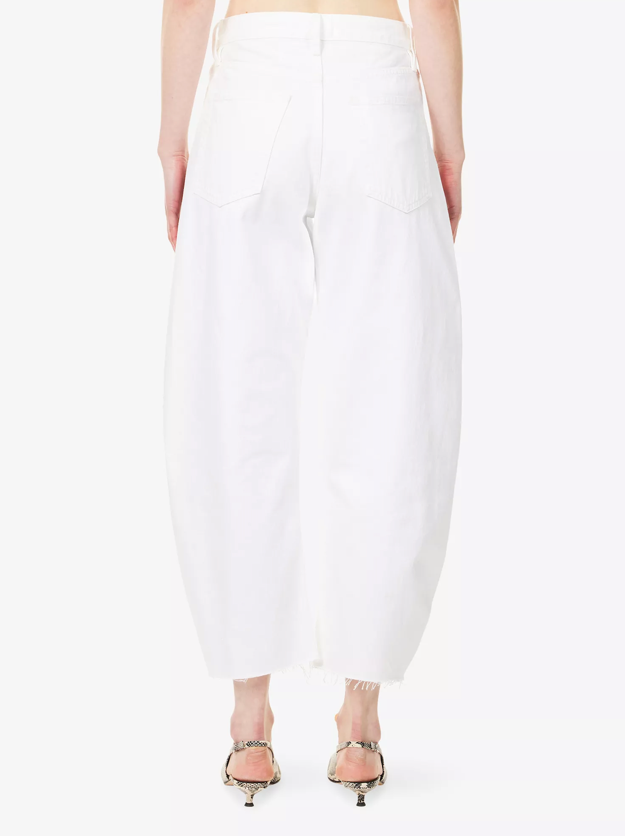 The best-selling Bubble, now with a shorter 27" inseam. The exaggerated take on the trending barrel silhouette is a unique fit and instant closet necessity. With a flattering high rise, these jeans have a curved outseam for a playful bubble effect. Note the light blue wash and raw, fringed hem for a pre-loved look.