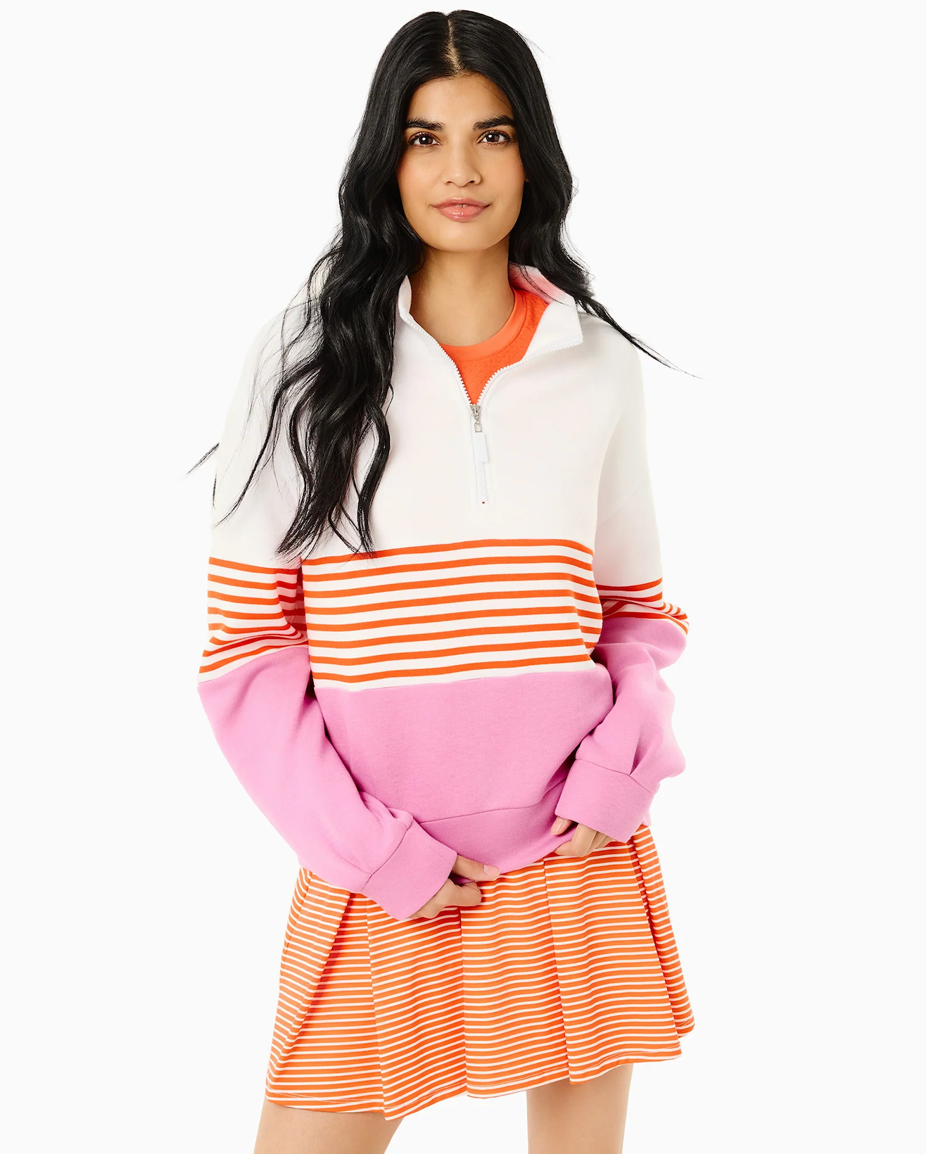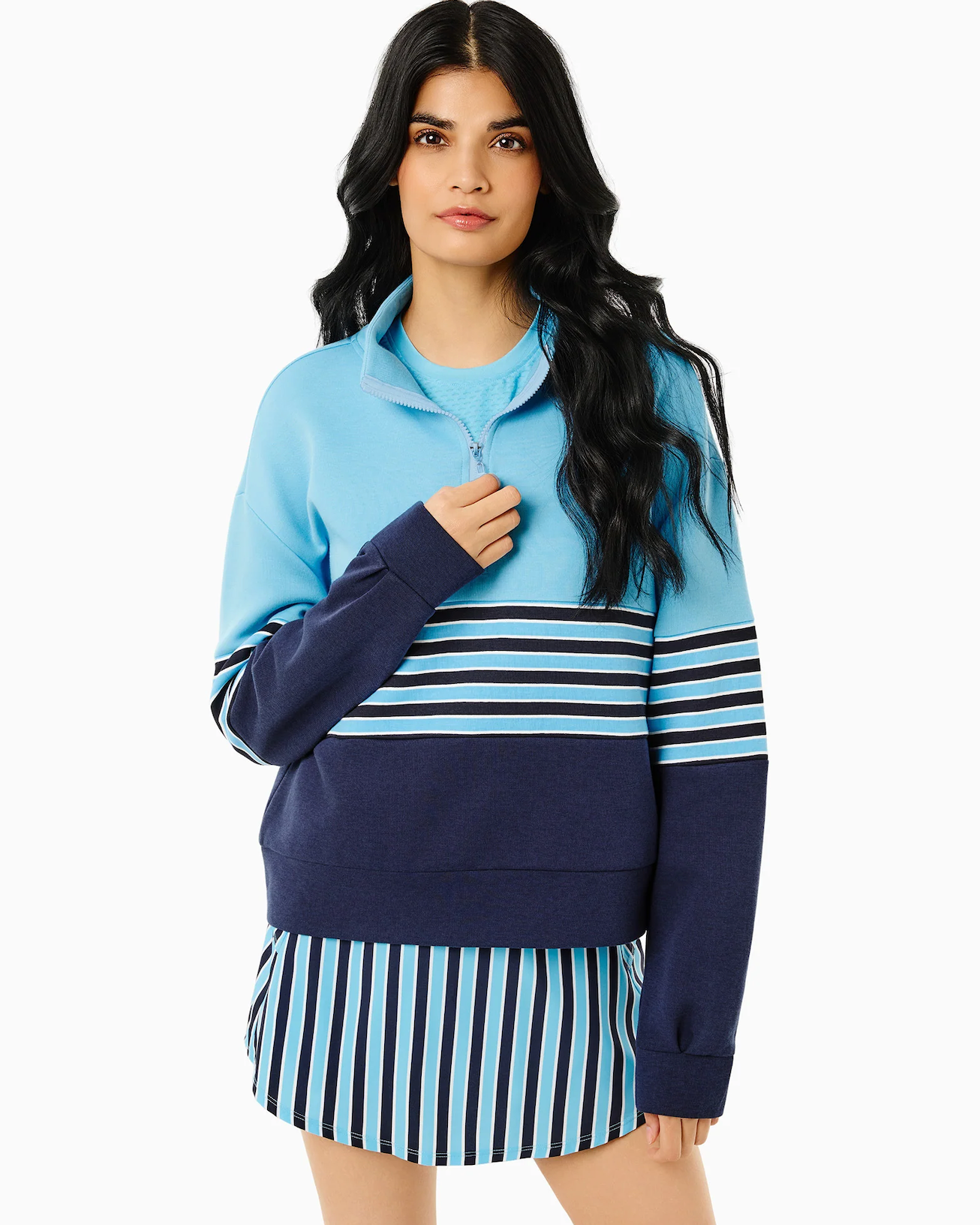 Meet the JV Quarter Zip! Your favorite classic quarter zip just got a mini makeover. Sister to our best-selling Varsity Quarter Zip, featuring a 6.5" shorter body, making it the perfect layer for your favorite skorts and dresses. Cozy meets chic in this quarter-zip sweatshirt; it’s the ultimate upgrade to your lounge look! Whether you’re sipping coffee or running errands- this piece keeps it cool, comfy, and effortlessly polished.