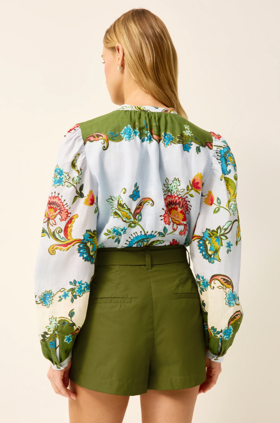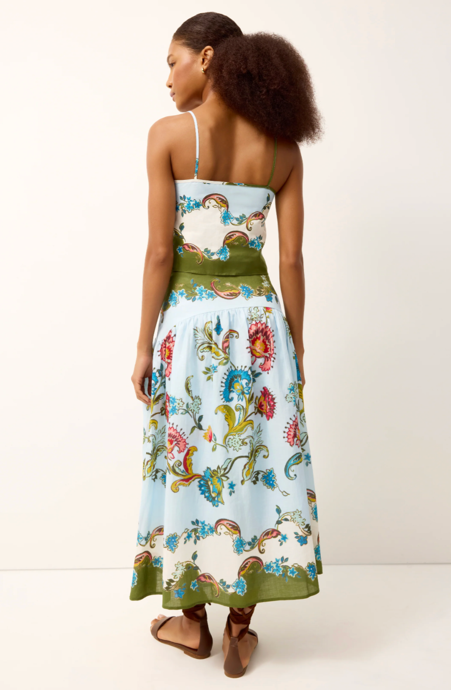 at the natural waist, it features a softly curved yoke that creates a flattering, modern silhouette before falling into a full skirt. In Delphi, a fresco-inspired print with an artistic feel, Vicki pairs effortlessly with simple tanks or the matching top for an elevated print-on-print look.