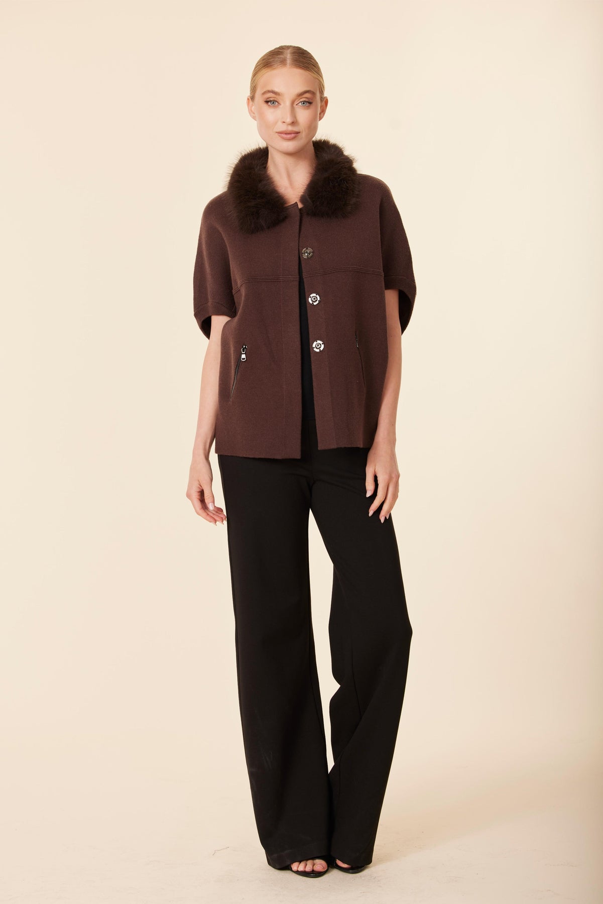 Drape yourself in the coziest comfort this fall with Dolce Cabo's Structured Short Sleeved Cardigan with Faux Fur Collar. Made of soft knit and featuring a plush collar, this unique piece adds cool sophistication to your casual outfits. It features front zip pockets, wide short sleeves, and snap closures for a secure fit. Perfect for layering, this structured cardigan is the ideal choice for chilly days, combining warmth and fashion effortlessly.