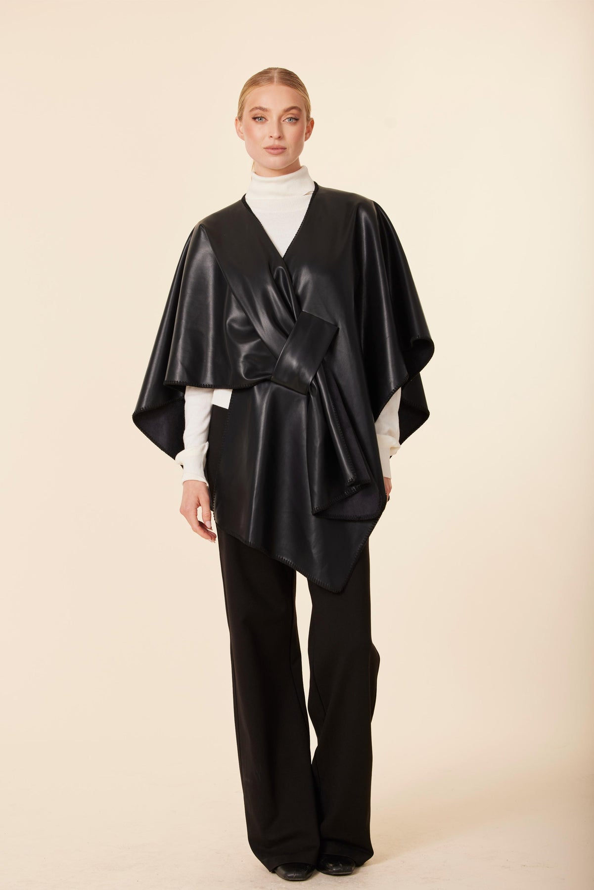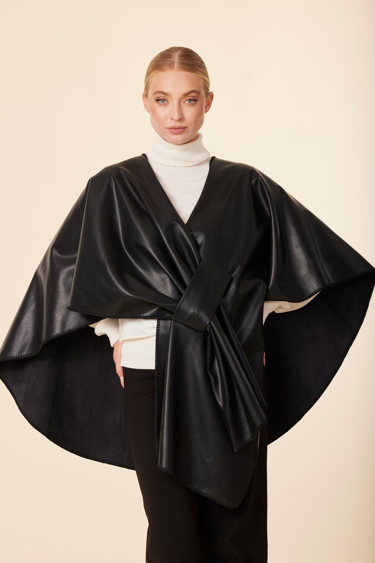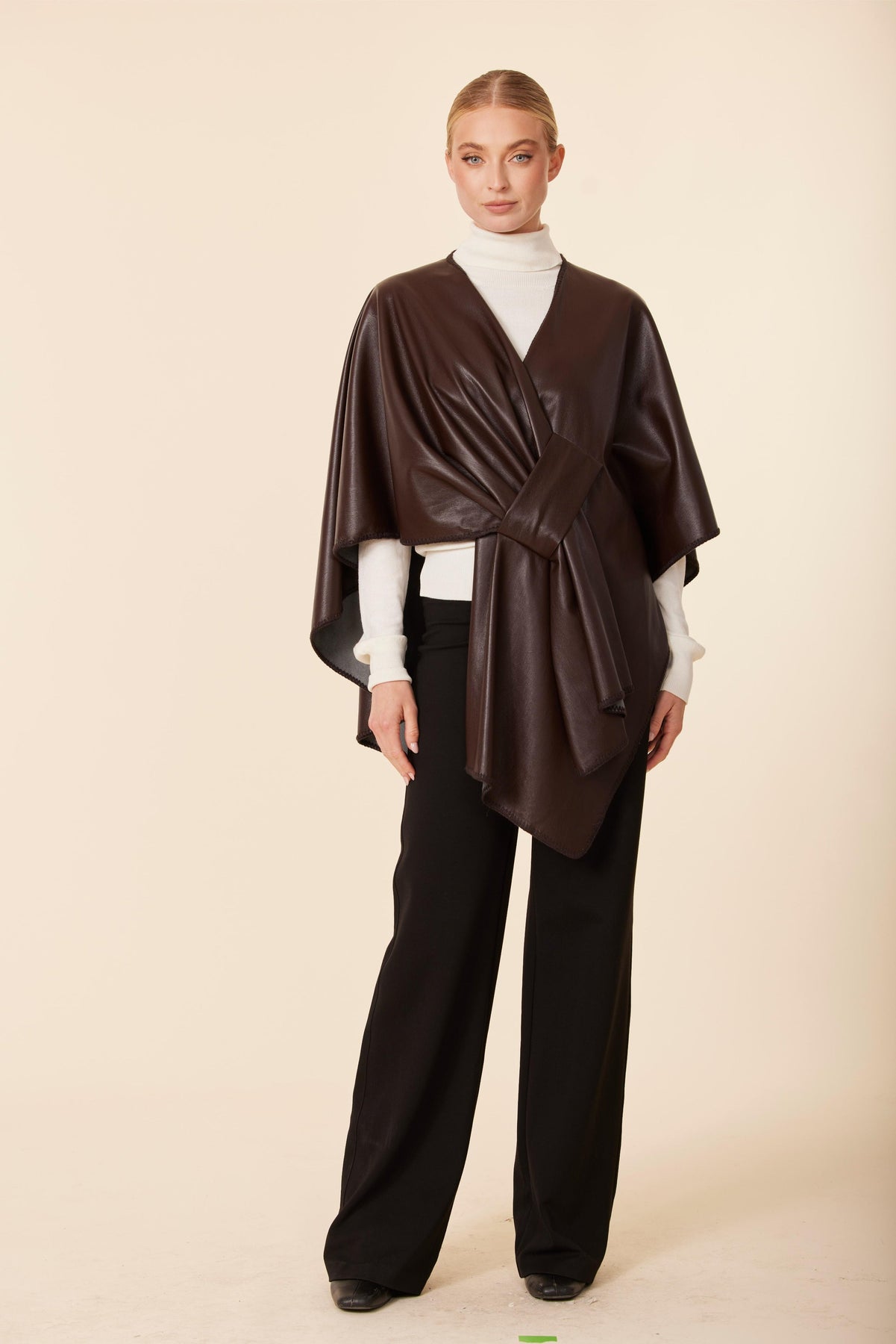 Stay cozy and chic in Dolce Cabo's faux leather wrap, a versatile layering piece perfect for Fall & Winter. Designed with a draped silhouette and soft faux suede lining, this faux leather cape wrap adds warmth and sophistication to any outfit. Pair it with sweaters, tailored pants, or dresses for effortless fall layering and seasonal style