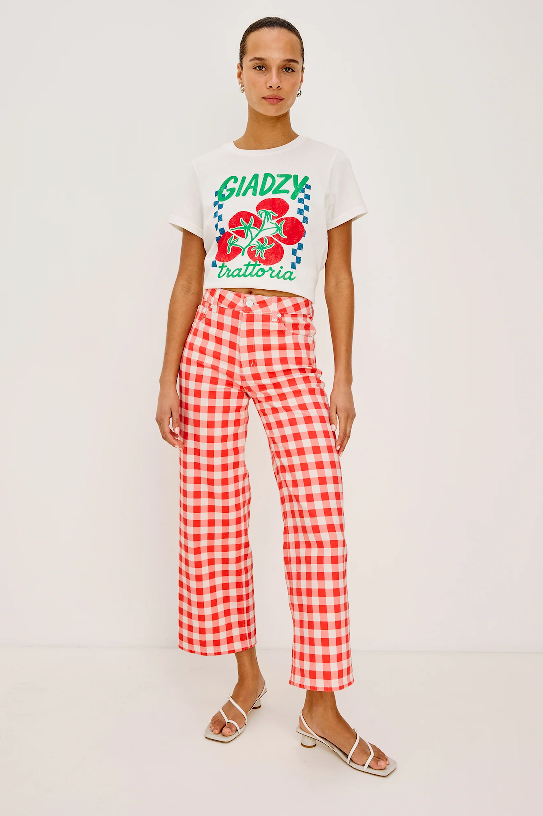 This Rhinestone Border Shrunken Tee reimagines the basics with a jeweled collar that catches the light beautifully. The rhinestone embellishment frames the neckline in pure sophistication, while the shrunken silhouette delivers modern appeal.