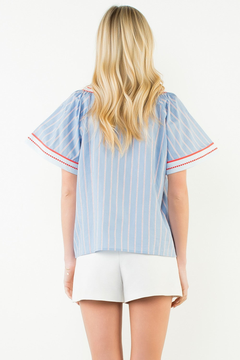 The Wildflower Bunch Emry Dress is your go-to for effortless style. Striped details on the placket, collar, cuffs, and belt create a preppy edge, while a cascading floral patterned ruffle hem adds feminine charm to your day-time look.