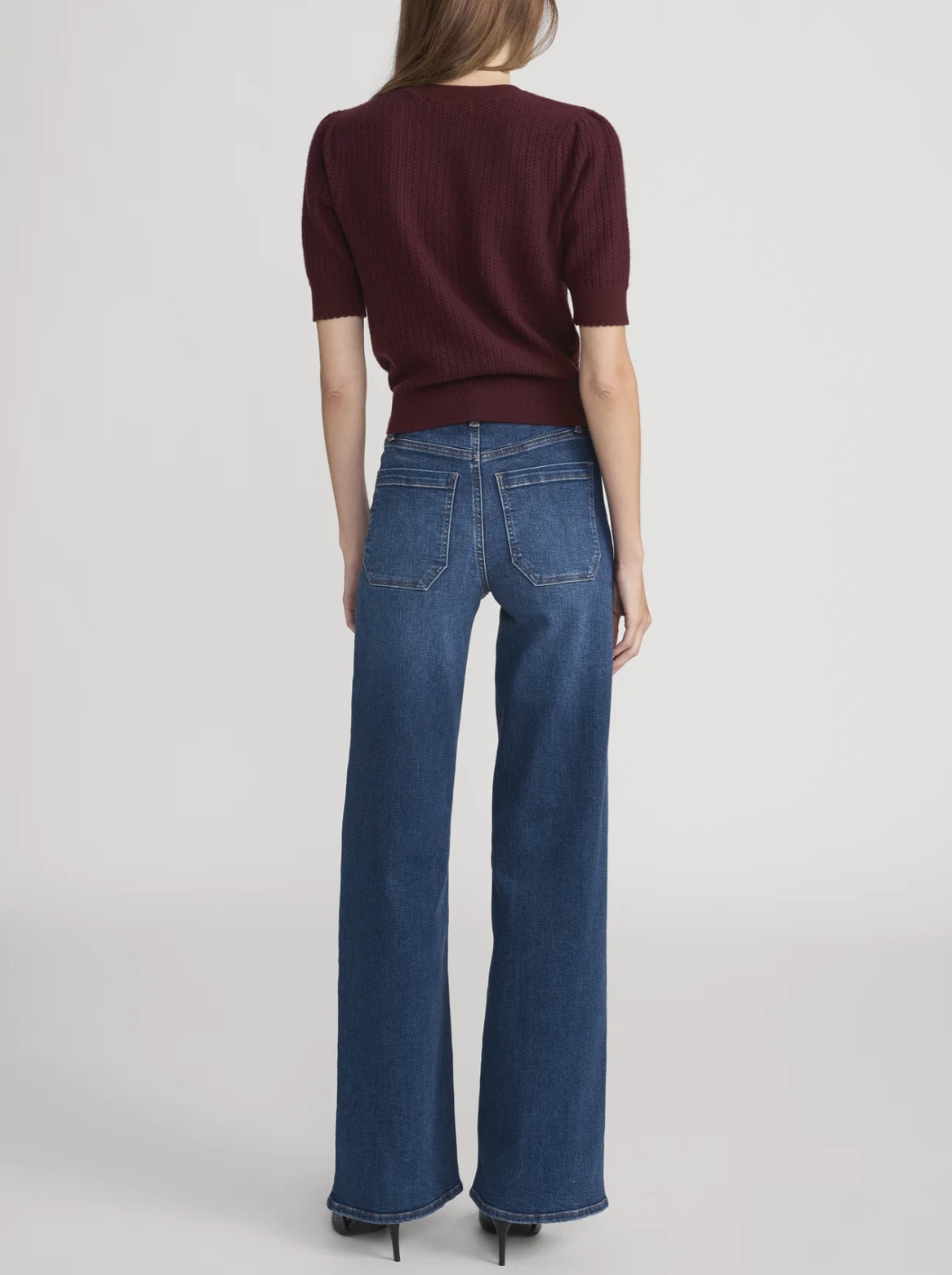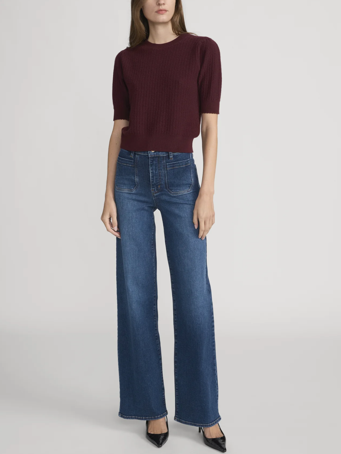 This short-sleeved cashmere sweater is knit in an airy chain-pointelle stitch. The sleeves are finished with feminine, softly scalloped edges. In a fresh seasonal cabernet colorway.
