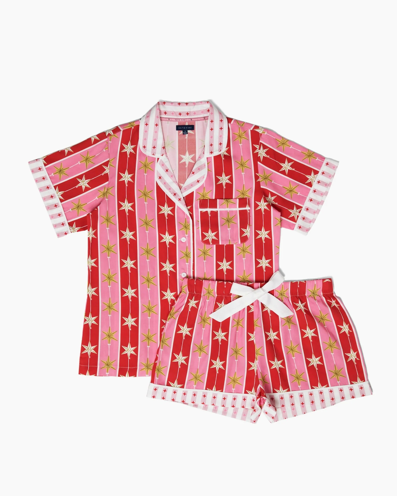 Bold red and pink stripes meet a string of stars in our Katie Kime Tree Topper print, a playful twist to classic holiday style. Our Women’s Pajama Shorts Set — is cut in a timeless silhouette with classic piping detail. The shorts’ elastic waist and adjustable ribbon tie ensure a custom, universally flattering fit.
