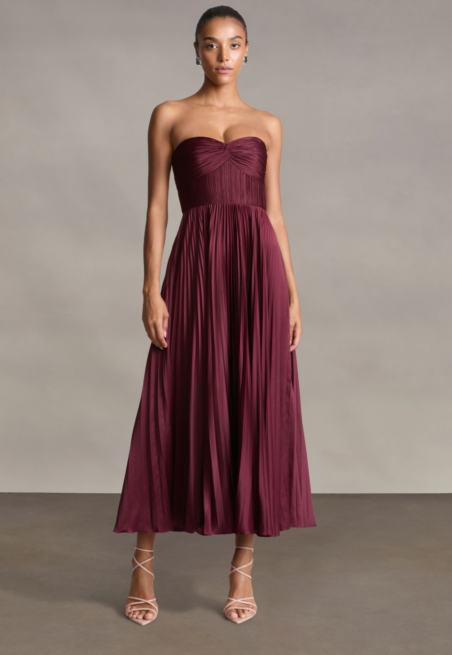 Our bestselling strapless ankle gown returns—this time in a delicious pinot noir hue. Designed with a pleated skirt and flirty sweetheart neckline, it's made to move.