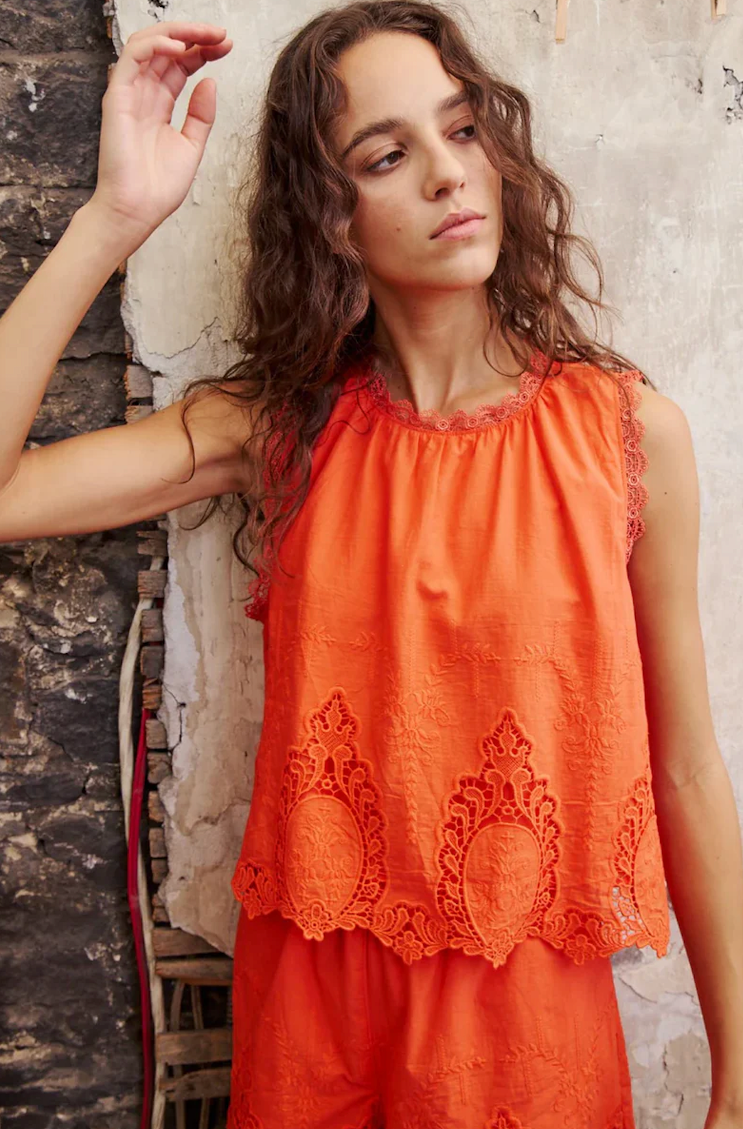 Flare top featuring a crew neckline with delicate lace trim and tonal floral embroidery throughout. Intricate open-knit lacy panels and a scalloped hem define the relaxed, airy silhouette
