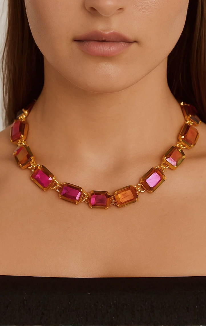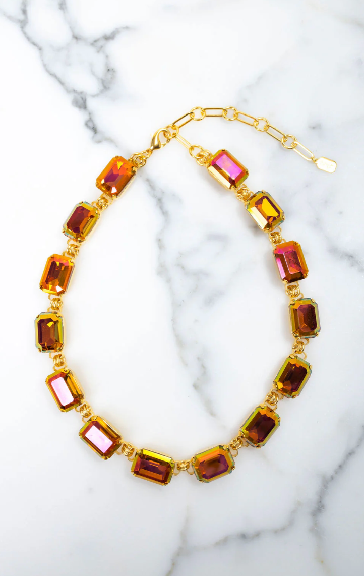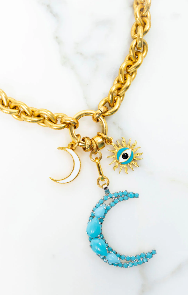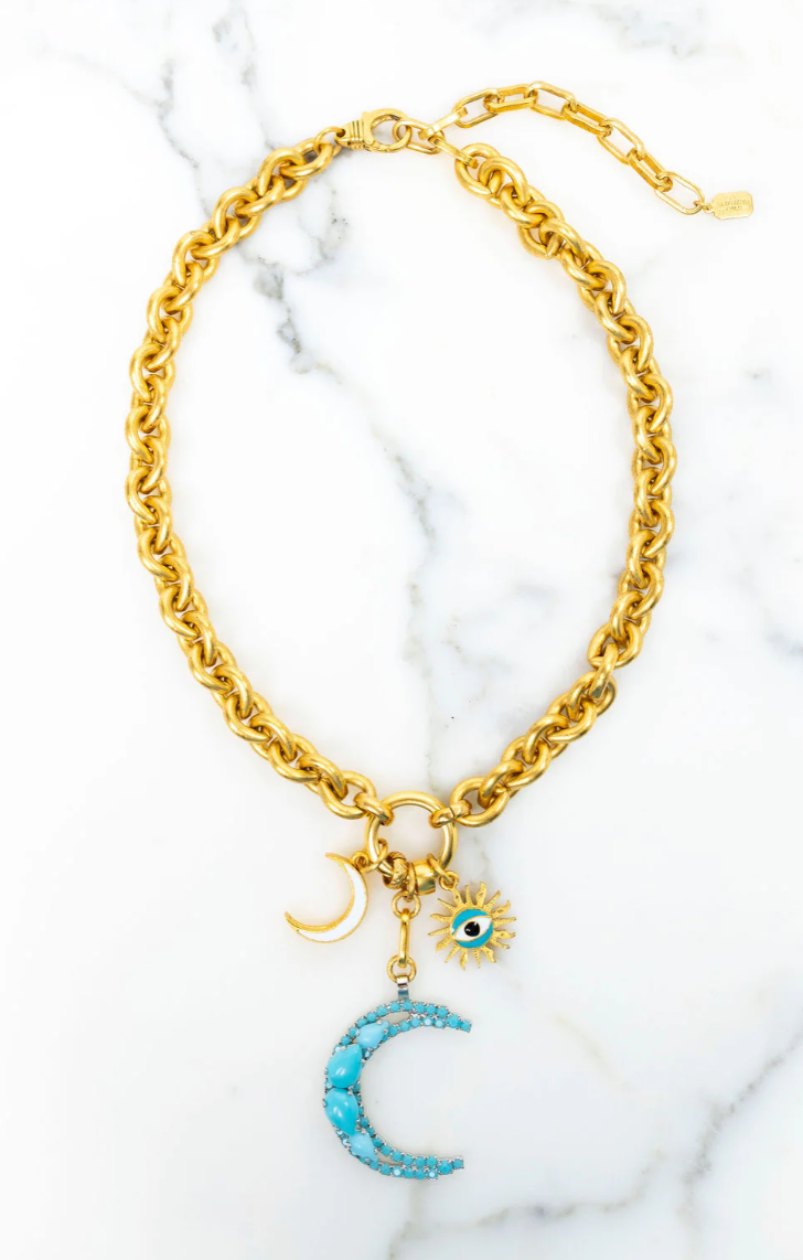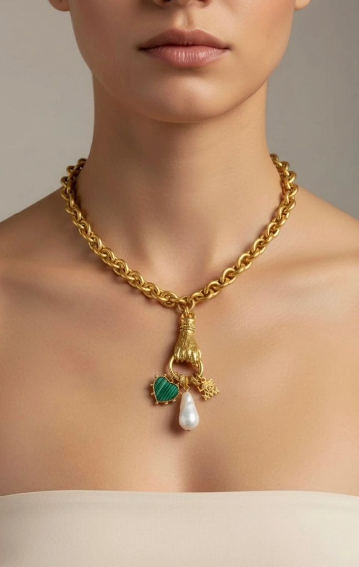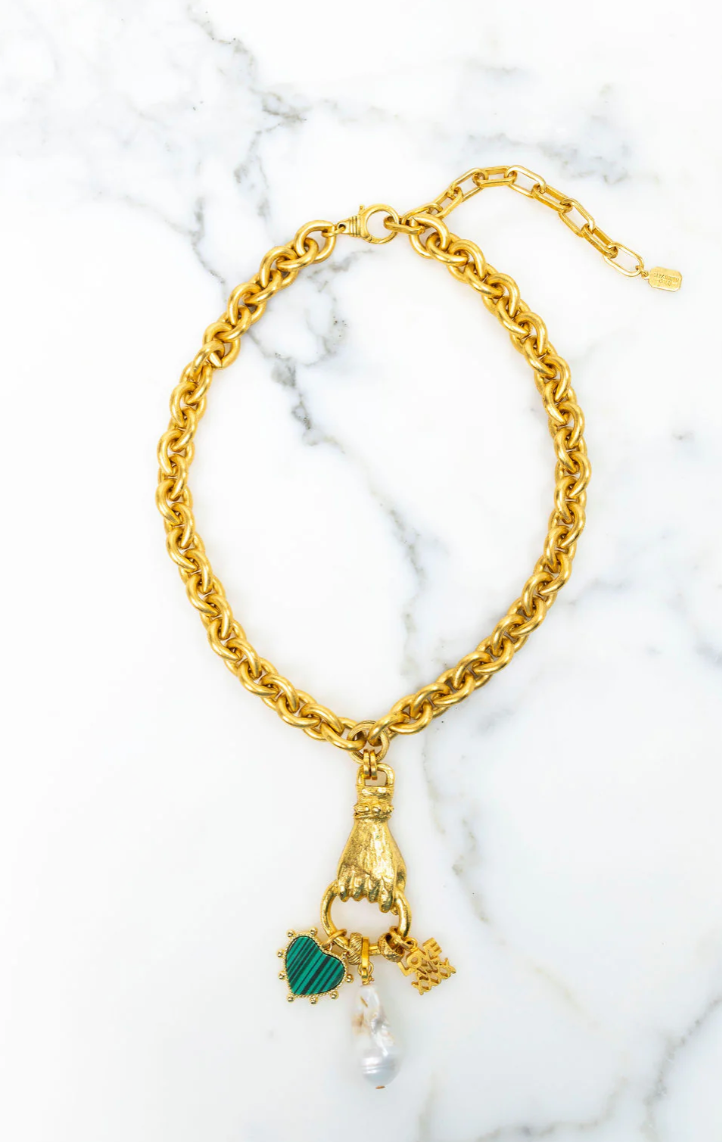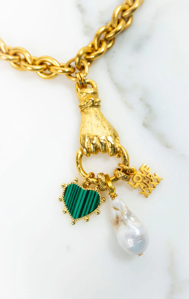 The Rowan Necklace features an open oval link chain with a striking hand charm gripping a ring adorned with a freshwater baroque pearl charm. Complemented by a faux-studded malachite heart charm, "love and xxx" charm, and textured rondell charms, this daring piece delivers a bold, layered look that commands attention. 24K Gold Plated, Lobster Claw Closure. Handcrafted in the U.S.A.