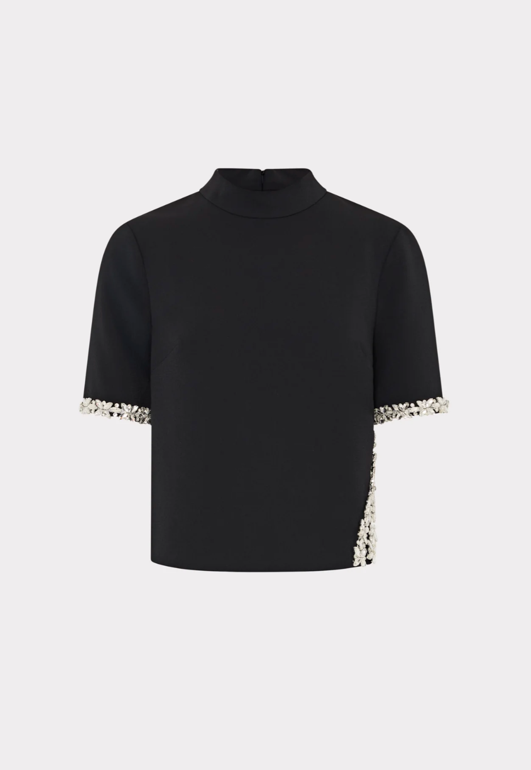 This oversized mockneck top is adorned with crystal detail on each sleeve and along a sizable slit that’s placed underneath the left arm. For the full look, wear it with its Ramona Crystal Trim Mini Skirt.