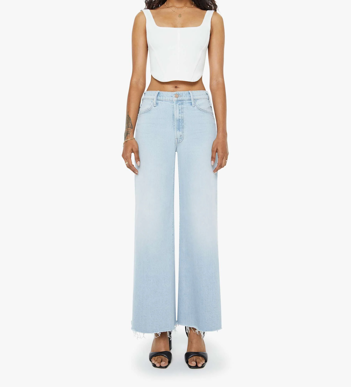 70s-inspired wide leg jeans with a high rise, zip fly, 32-inch inseam and a clean hem. Cut from stretch denim, Complete 360 is a light blue with subtle fading throughout. Made from semi-rigid SUPERIOR denim, I Confess is a light blue with whiskering and fading at the knees.