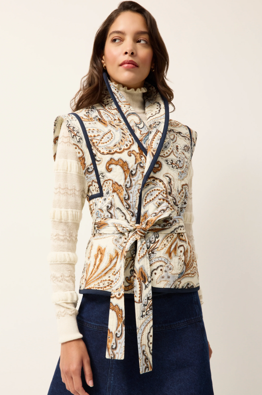 We’ve always leaned into assertive shapes with a decidedly feminine feel, and the Bowtie vest is no exception. A shawl collar wrap front balances a meandering paisley, while contemporary quilted cotton construction adds textual elegance. A trapunto stitch tie belt tailors the vest to your shape, along with an inside waist tie for an even more adjustable fit. We love how the vest can act as a statement piece on its own, or can be layered over matching Trinity print pieces like Eloise and Estine for a coordinated look.